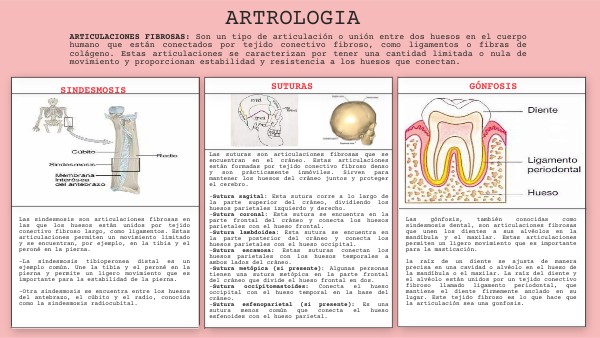 ARTICULACIONES FIBROSAS: Son un tipo de articulación o unión entre dos huesos en el cuerpo humano que están conectados por tejido conectivo fibroso, como ligamentos o fibras de colágeno. Estas articulaciones se caracterizan por tener una cantidad limitada o nula de movimiento y proporcionan estabilidad y resistencia a los huesos que conectan.