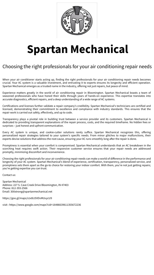 When your air conditioner starts acting up, finding the right professionals for your air conditioning repair needs becomes crucial. Your AC system is a valuable investment, and entrusting it to experts ensures its longevity and efficient operation. Spartan Mechanical emerges as a trusted name in the industry, offering not just repairs, but peace of mind. Experience matters greatly in the world of air conditioning repair in Bloomington. Spartan Mechanical boasts a team of seasoned professionals who have honed their skills through years of hands-on experience. This expertise translates into accurate diagnostics, efficient repairs, and a deep understanding of a wide range of AC systems. Certifications and licenses further validate a repair company's credibility. Spartan Mechanical's technicians are certified and licensed, demonstrating their commitment to excellence and compliance with industry standards. This ensures that the repair work is carried out safely, effectively, and up to code. Transparency plays a pivotal role in building trust between a service provider and its customers. Spartan Mechanical is dedicated to providing transparent explanations of the repair process, costs, and the required timeframe. No hidden fees or surprises – just honest and upfront communication. Every AC system is unique, and cookie-cutter solutions rarely suffice. Spartan Mechanical recognizes this, offering personalized repair strategies tailored to your system's specific needs. From minor glitches to major malfunctions, their experts devise solutions that address the root cause, ensuring your AC runs smoothly long after the repair is done. Promptness is essential when your comfort is compromised. Spartan Mechanical understands that an AC breakdown in the scorching heat requires swift action. Their responsive customer service ensures that your repair needs are addressed promptly, minimizing discomfort and inconvenience. Choosing the right professionals for your air conditioning repair needs can make a world of difference in the performance and longevity of your AC system. Spartan Mechanical's blend of experience, certification, transparency, personalized service, and promptness sets them apart as the go-to choice for restoring your indoor comfort. With them, you're not just getting repairs; you're getting expertise you can trust. Contact us: Spartan Mechanical Address: 227 S. Cave Creek Drive Bloomington, IN 47403 Phone: 812-393-2566 Email: 300strong@spartanmechanical.net https://goo.gl/maps/s1xt8J5VDvMUvycU9 visit : https://www.google.com/maps?cid=16486639611355672236