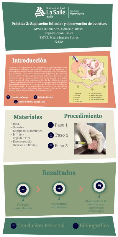 En conclusión, considero que con esta práctica aprendí mucha información valiosa acerca de las diferentes estructuras que se encuentran en los ovarios y como estas se van desarrollando para dar lugar a la ovulación, es decir, como se transforman los folículos para liberar al ovocito, y la formación del cuerpo lúteo. Considero que toda esta información es fundamental para mi como estudiante de veterianria puesto que me permite entender mejor los diferentes procesos que se llevan a cabo en el cuerpo de las hembras para poder realizar la reproducción. Además, fue interesante el poder realizar la técnica de aspirado para ver los ovocitos ya que me di cuenta que no es un proceso fácil.