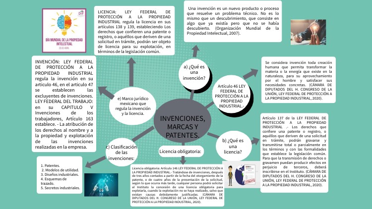 INVENCIÓN: LEY FEDERAL DE PROTECCIÓN A LA PROPIEDAD INDUSTRIAL regula la invención en su articulo 46, en el articulo 47 se establecen las excluyentes de invenciones. LEY FEDERAL DEL TRABAJO: en su CAPITULO V Invenciones de los trabajadores, Artículo 163 establece. - La atribución de los derechos al nombre y a la propiedad y explotación de las invenciones realizadas en la empresa.
