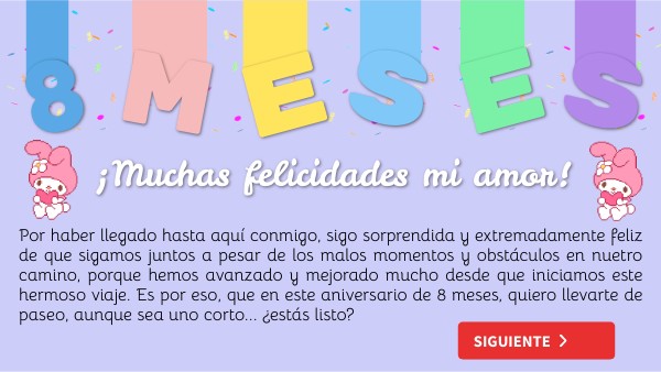 De verdad espero que te haya gustado mucho este pequeño regalo, lo hice con mucho cariño, y aunque por ahora sea así, sé que después todo esto será realidad, porque confío mucho en lo nuestro, y en que lo lograremos no importa que. Muchas gracias por estos 8 meses tan maravillosos e importantes, llenos de recuerdos, historias, pláticas, risas, juegos y momentos románticos, pero sobretodo, gracias por ser tú, tú eres esa persona importante que junto a mi ha tomado el riesgo de adentrarnos en este viaje que no sabemos cuanto dure o cuando termine, solo espero que lleguemos lo más lejos posible, con lo mejor de cada uno, y sigamos aprendiendo y creciendo como lo hemos estado haciendo.