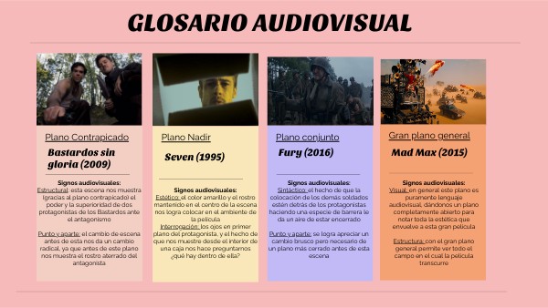Signos audiovisuales:Didáctico: es un plano con el objetivo de expresar información dentro de la escena Diálogo: este plano básicamente es utilizado para mostrar una conversación en cuadro, en este caso un diálogo un tanto profundo