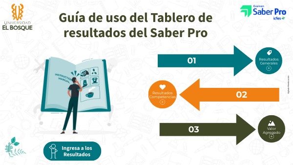 En color verde, observaras los resultados globales del programa seleccionado de la Universidad el Bosque, en naranja, el promedio de los resultados globales de la institución, y en color azul, los resultados promedios de los programas referentes en Colombia. Adicional, puedes trabajar con los distintos filtros del tablero, cómo el sector, el reconocimiento del programa, o el municipio donde se oferta, para realizar análisis más detallados.