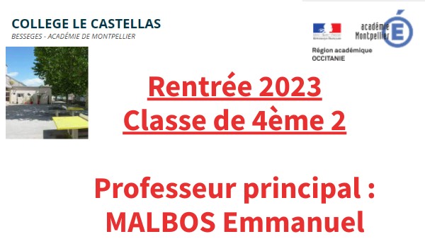 Rentrée 2023 Classe de 4ème 2 Professeur principal : MALBOS Emmanuel