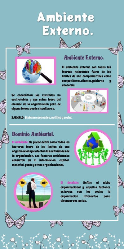 El ambiente: Se puede definir como todos los factores fuera de los limites de una organizacion que afectan las actividades de la organizacion. Los factores ambientales consisten en la informacion, capital. material, gente y otras organizaciones.