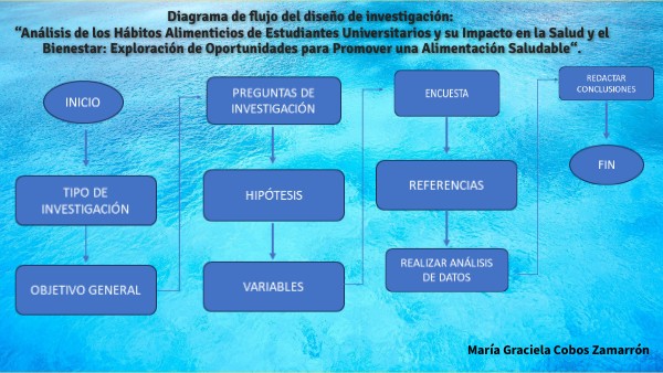 Diagrama de flujo del diseño de investigación: “Análisis de los Hábitos Alimenticios de Estudiantes Universitarios y su Impacto en la Salud y el Bienestar: Exploración de Oportunidades para Promover una Alimentación Saludable“.