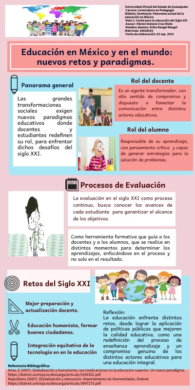 Universidad Virtual del Estado de Guanajuato Carrera: Licenciatura en Pedagogía Módulo: Seminario: Panorama actual de la educación en México Reto 1: Cartel para la educación del Siglo XXI Asesor: Héctor Antonio Cruz Nieto Nombre alumno: Erika Rangel Rangel Matricula: 20028335 Fecha de elaboración: 03 sep. 2023