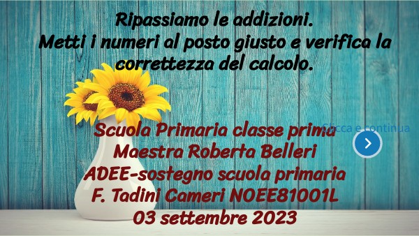 Ripassiamo le addizioni. Metti i numeri al posto giusto e verifica la correttezza del calcolo. Scuola Primaria classe prima Maestra Roberta Belleri ADEE-sostegno scuola primaria F. Tadini Cameri NOEE81001L 03 settembre 2023