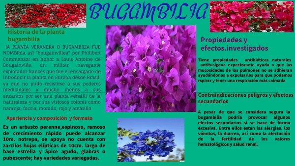 lA PLANTA VERANERA O BUGAMBILIA FUE NOMBRda así "bougainvillea" por Philibert Commensor en honor a Louis Antoine de Bougainville, un militar .navegante explorador francés que fue el encargado de introducir la planta en Europa desde Brasil ya que no pudo resistirse a sus poderes medicinales y mucho menos a sus encantos por ser una planta versátil de la naturaleza y por sus vistosos colores como naranja, fucsia, morado, rojo y amarillo