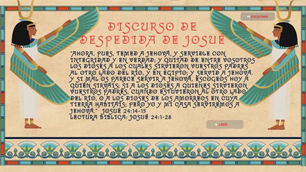“Ahora, pues, temed a Jehová, y servidle con integridad y en verdad; y quitad de entre vosotros los dioses a los cuales sirvieron vuestros padres al otro lado del río, y en Egipto; y servid a Jehová. Y si mal os parece servir a Jehová, escogeos hoy a quién sirváis; si a los dioses a quienes sirvieron vuestros padres, cuando estuvieron al otro lado del río, o a los dioses de los amorreos en cuya tierra habitáis; pero yo y mi casa serviremos a Jehová.” Josué 24:14-15Lectura Biblica: Josué 24:1-28