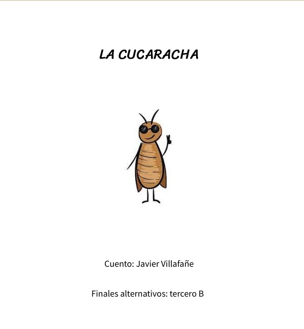 El hombre al ver esto se sentía mal tan mal que no dormía solo tomaba cerveza. Un día la cucaracha no volvió más y el hombre pensó que se había muerto. Pero no era así sino que se estaba recuperando y al tiempo volvió la cucaracha con una mejor pata y con algo raro podía hablar, el hombre al ver y oír eso le pidió disculpas y que no sabía lo que hacía porque estaba borracho. La cucaracha lo perdonó y le dijo; no hay problema, mejor vamos a tomar unas cervezas. El hombre acepto y los dos se fueron felices y borrachos.