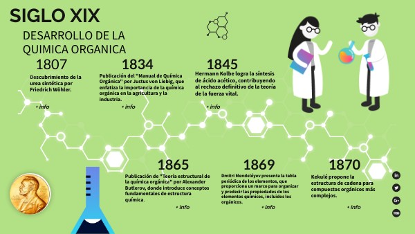 Dmitri Mendeléyev presenta la tabla periódica de los elementos, que proporciona un marco para organizar y predecir las propiedades de los elementos químicos, incluidos los orgánicos.
