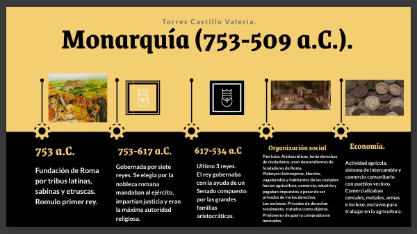 Gobernada por siete reyes. Se elegia por la nobleza romana mandaban al ejército, impartían justicia y eran la máxima autoridad religiosa.
