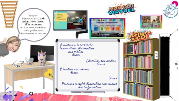 Bonjour ! Bienvenue au CDI du collège Notre Dame de la Jeunesse Je suis Mme Montrésor, votre professeur documentaliste virtuelle