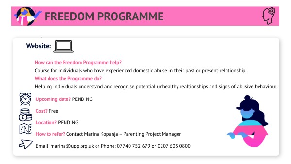 Upcoming date? PENDING Cost? Free Location? PENDING How to refer? Contact Marina Kopanja – Parenting Project Manager Email: marina@upg.org.uk or Phone: 07740 752 679 or 0207 605 0800