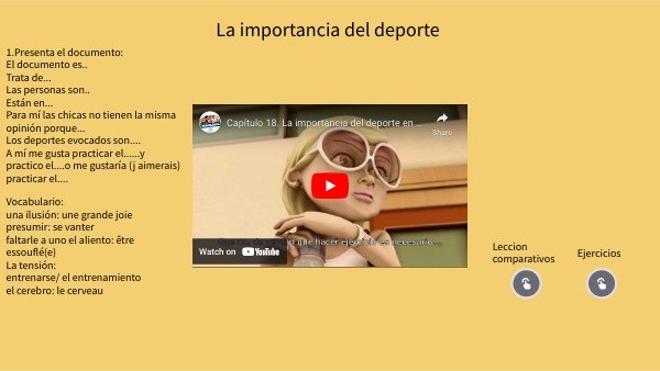 1.Presenta el documento: El documento es.. Trata de... Las personas son.. Están en... Para mí las chicas no tienen la misma opinión porque... Los deportes evocados son.... A mí me gusta practicar el......y practico el....o me gustaría (j aimerais) practicar el....