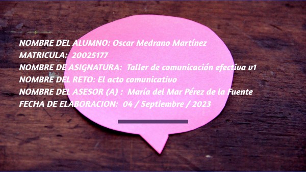 NOMBRE DEL ALUMNO: Oscar Medrano MartínezMATRICULA: 20025177 NOMBRE DE ASIGNATURA: Taller de comunicación efectiva v1 NOMBRE DEL RETO: El acto comunicativo NOMBRE DEL ASESOR (A) : María del Mar Pérez de la Fuente FECHA DE ELABORACION: 04 / Septiembre / 2023