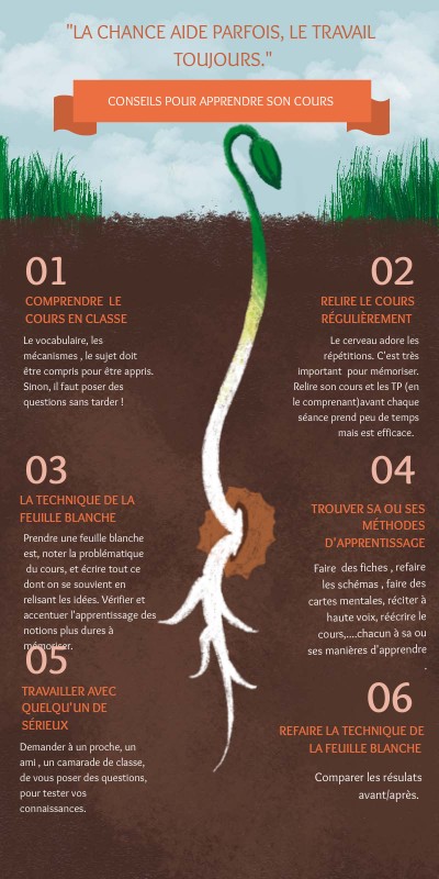 Prendre une feuille blanche est, noter la problématique du cours, et écrire tout ce dont on se souvient en relisant les idées. Vérifier et accentuer l'apprentissage des notions plus dures à mémoriser.