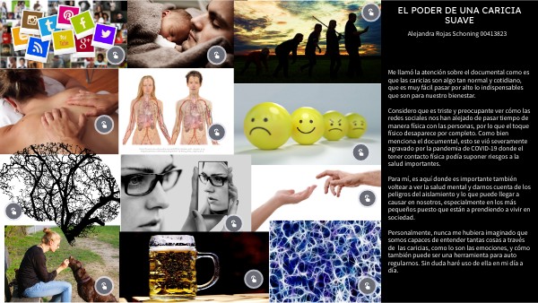 Me llamó la atención sobre el documental como es que las caricias son algo tan normal y cotidiano, que es muy fácil pasar por alto lo indispensables que son para nuestro bienestar. Considero que es triste y preocupante ver cómo las redes sociales nos han alejado de pasar tiempo de manera física con las personas, por lo que el toque físico desaparece por completo. Como bien menciona el documental, esto se vió severamente agravado por la pandemia de COVID-19 donde el tener contacto física podía suponer riesgos a la salud importantes. Para mí, es aquí donde es importante también voltear a ver la salud mental y darnos cuenta de los peligros del aislamiento y lo que puede llegar a causar en nosotros, especialmente en los más pequeños puesto que están a prendiendo a vivir en sociedad. Personalmente, nunca me hubiera imaginado que somos capaces de entender tantas cosas a través de las caricias, como lo son las emociones, y cómo también puede ser una herramienta para auto regularnos. Sin duda haré uso de ella en mi día a día.