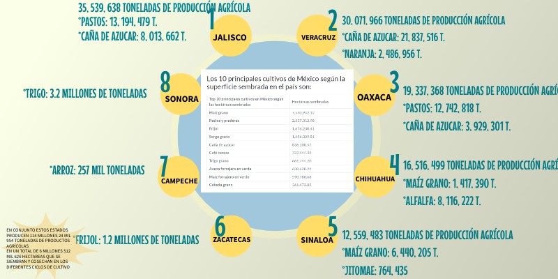 EN CONJUNTO ESTOS ESTADOS PRODUCEN 114 MILLONES 24 MIL 954 TONELADAS DE PRODUCTOS AGRÍCOLAS EN UN TOTAL DE 6 MILLONES 512 MIL 626 HECTAREAS QUE SE SIEMBRAN Y COSECHAN EN LOS DIFERENTES CICLOS DE CULTIVO