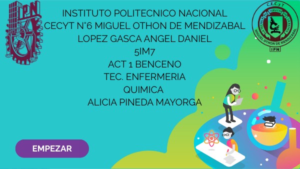 INSTITUTO POLITECNICO NACIONALCECYT N°6 MIGUEL OTHON DE MENDIZABAL LOPEZ GASCA ANGEL DANIEL 5IM7 ACT 1 BENCENO TEC. ENFERMERIA QUIMICA ALICIA PINEDA MAYORGA