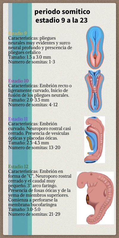 Estadio 9 Caracteristicas: pliegues neurales muy evidentes y surco neural profundo y prescencia de pliegues cefalico Tamaño: 1.5 a 3.0 mm Numero de somitas: 1-3 Estadio 10 Caracteristicas: Embrión recto o ligeramente curvado, Inicio de fusión de los pliegues neurales. Tamaño: 2.0-3.5 mm Numero de somitas: 4-12 Estadio 11 Caracteristicas: Embrión curvado. Neuroporo rostral casi cerrado. Presencia de vesículas ópticas y placodas óticas. Tamaño: 2.5-4.5 mm Numero de somitas: 13-20 Estadio 12 Caracteristicas: Embrión en forma de "C", Neuroporo rostral cerrado y el caudal muy pequeño. 3" arco faríngo. Presencia de fosas óticas y de la yema de miembros superiores. Comienza a perforarse la membrana bucofaríngea Tamaño: 3.0-5.0 Numero de somitas: 21-29