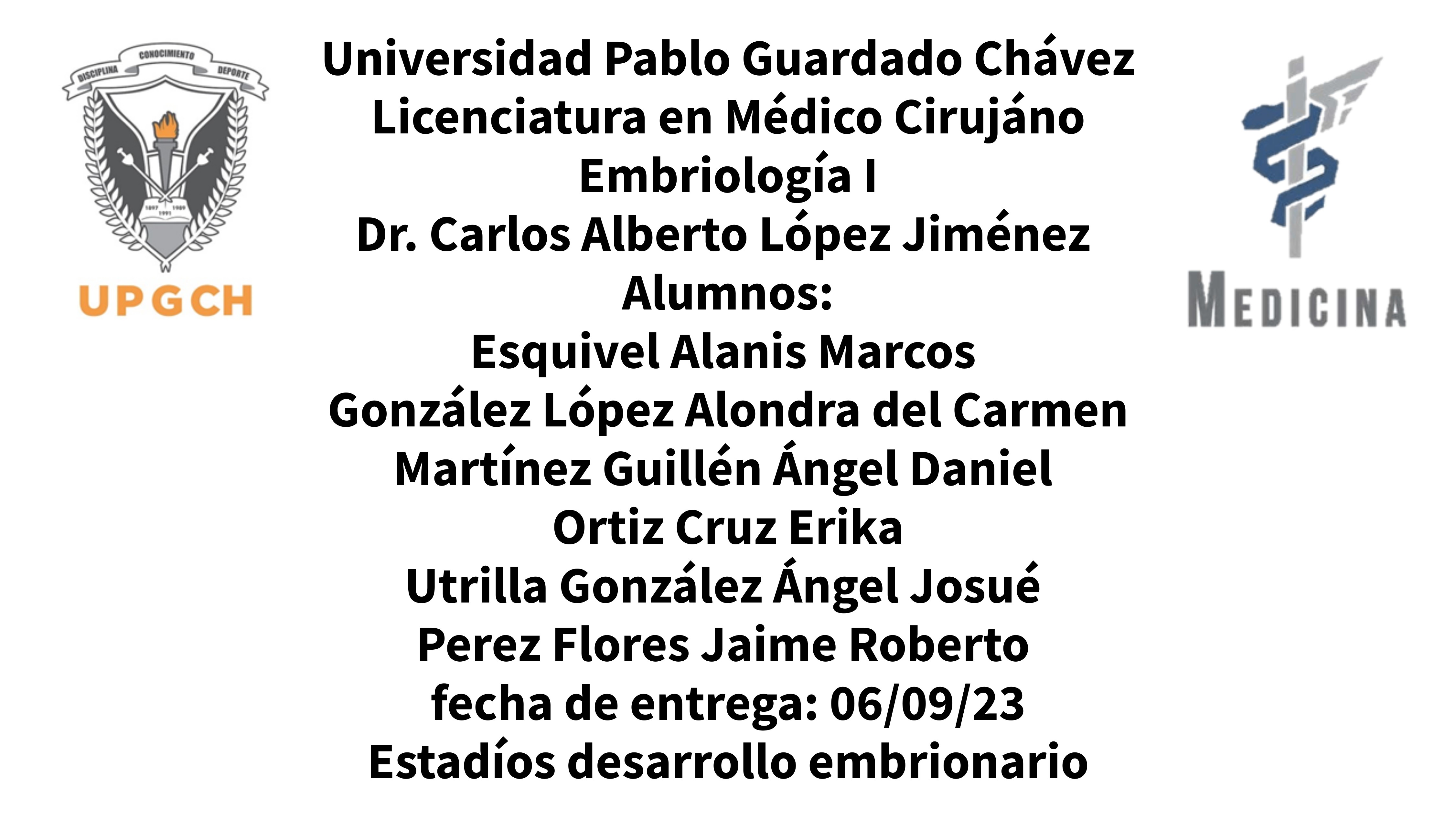 Universidad Pablo Guardado Chávez Licenciatura en Médico Cirujáno Embriología I Dr. Carlos Alberto López Jiménez Alumnos: Esquivel Alanis Marcos González López Alondra del Carmen Martínez Guillén Ángel Daniel Ortiz Cruz Erika Utrilla González Ángel Josué Perez Flores Jaime Roberto fecha de entrega: 06/09/23 Estadíos desarrollo embrionario