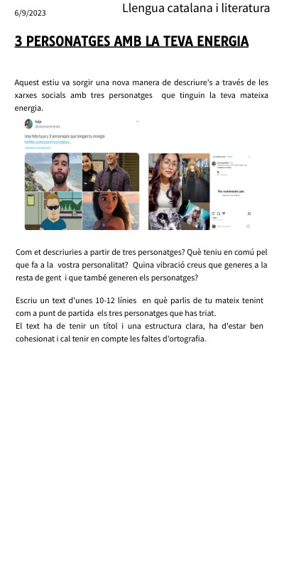 Escriu un text d'unes 10-12 línies en què parlis de tu mateix tenint com a punt de partida els tres personatges que has triat.El text ha de tenir un títol i una estructura clara, ha d'estar ben cohesionat i cal tenir en compte les faltes d'ortografia.