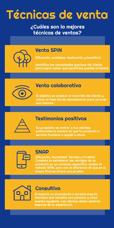 Ejemplo de técnica de venta de uso de testimonios Actualmente, hay muchas formas de verificar comentarios y reseñas sobre un producto. Al platicar con el prospecto, el vendedor podría tomar los testimonios de diferentes canales para argumentar su venta. Por ejemplo, las reseñas de Google, comentarios en redes sociales o alguna entrevista de un cliente en la que destaque cómo ese producto o servicio le ayudó a su negocio. Venta SNAP Esta técnica de venta la utilizan mucho los vendedores para ser más eficientes en su proceso de venta con prospectos y clientes. Consiste en establecer las ventajas de un producto en un contexto específico, similar al método SPIN, pero con la diferencia de que en la etapa final se ofrece una prueba. A continuación, puedes ver qué significan estas siglas: SITUATION (situación): aquí hay que ubicar cuál es la situación actual del cliente y comprender sus necesidades y desafíos. NEED (necesidad): en esta etapa haces evidentes las necesidades del cliente. ADVANTAGE (ventaja): consiste en presentar al cliente la solución que mejor se adapta a sus necesidades, destacando las ventajas y beneficios de esa solución. PROOF (prueba): en esta fase se proporciona evidencia de que la solución presentada puede resolver las necesidades del cliente. Ejemplo de una venta con el método SNAP Imagina un agente de bienes raíces: este debería ubicar la situación de su cliente potencial, quien le ha dicho que busca una casa en una zona tranquila y segura, cerca de una escuela para sus hijos. Para remarcar la necesidad, el vendedor podría hacer preguntas como «¿qué características requiere de una casa?» y resaltar las ventajas de las casas que está vendiendo y se acercan a lo que está buscando esa persona. Por último, las pruebas podrían ser fotos o videos del inmueble e, incluso, una visita al lugar.