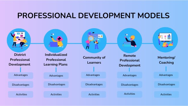 Characteristics: Teachers learn from colleagues or peers within the same organization. For example, grade-level and department teams. Through collaboration, the professional learning can be tailored to provide chances for learning that are pertinent and useful (Fogarty & Pete). Effectiveness: This model is effective for sharing best practices and promoting collaboration. By sharing their experiences in the classroom, teachers can learn one another important skills and strategies.