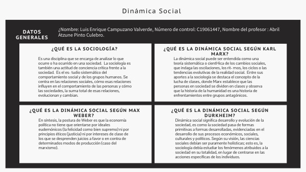 La dinámica social puede ser entendida como una teoría sistemática o cientHica de los cambios sociales, que indaga las oscilaciones, los rit- mos, los ciclos o las tendencias evolutivas de la realidad social. Entre sus aportes a la sociología se destaca el concepto de la lucha de clases, donde Marx establece que las personas en sociedad se dividen en clases y observa que la historia de la humanidad es una historia de enfrentamientos entre grupos antagónicos.