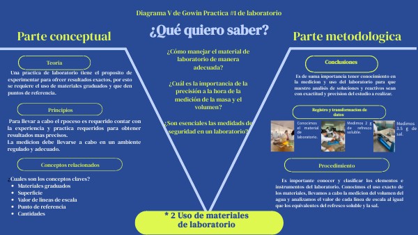 Es importante conocer y clasificar los elementos e instrumentos del laboratorio. Conocimos el uso exacto de los materiales, llevamos a cabo la medicion del volumen del agua y analizamos el valor de cada linea de escala al igual que los equivalentes del refresco soluble y la sal.