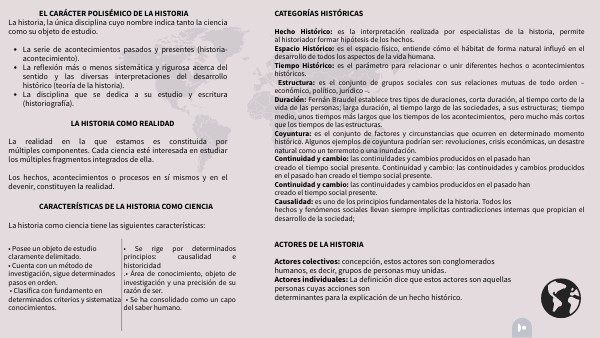 Hecho Histórico: es la interpretación realizada por especialistas de la historia, permite al historiador formar hipótesis de los hechos.Espacio Histórico: es el espacio físico, entiende cómo el hábitat de forma natural influyó en el desarrollo de todos los aspectos de la vida humana. Tiempo Histórico: es el parámetro para relacionar o unir diferentes hechos o acontecimientos históricos. Estructura: es el conjunto de grupos sociales con sus relaciones mutuas de todo orden – económico, político, jurídico –. Duración: Fernán Braudel establece tres tipos de duraciones, corta duración, al tiempo corto de la vida de las personas; larga duración, al tiempo largo de las sociedades, a sus estructuras; tiempo medio, unos tiempos más largos que los tiempos de los acontecimientos, pero mucho más cortos que los tiempos de las estructuras. Coyuntura: es el conjunto de factores y circunstancias que ocurren en determinado momento histórico. Algunos ejemplos de coyuntura podrían ser: revoluciones, crisis económicas, un desastre natural como un terremoto o una inundación. Continuidad y cambio: las continuidades y cambios producidos en el pasado han creado el tiempo social presente. Continuidad y cambio: las continuidades y cambios producidos en el pasado han creado el tiempo social presente. Continuidad y cambio: las continuidades y cambios producidos en el pasado han creado el tiempo social presente. Causalidad: es uno de los principios fundamentales de la historia. Todos los hechos y fenómenos sociales llevan siempre implícitas contradicciones internas que propician el desarrollo de la sociedad;