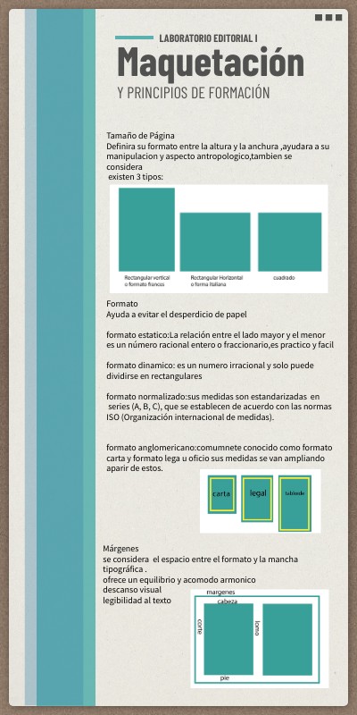 Formato Ayuda a evitar el desperdicio de papel formato estatico:La relación entre el lado mayor y el menor es un número racional entero o fraccionario,es practico y facil formato dinamico: es un numero irracional y solo puede dividirse en rectangulares formato normalizado:sus medidas son estandarizadas en series (A, B, C), que se establecen de acuerdo con las normas ISO (Organización internacional de medidas). formato anglomericano:comumnete conocido como formato carta y formato lega u oficio sus medidas se van ampliando aparir de estos.