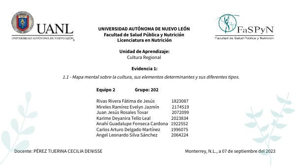 UNIVERSIDAD AUTÓNOMA DE NUEVO LEÓN Facultad de Salud Pública y Nutrición Licenciatura en Nutrición Unidad de Aprendizaje:Cultura Regional Evidencia 1: