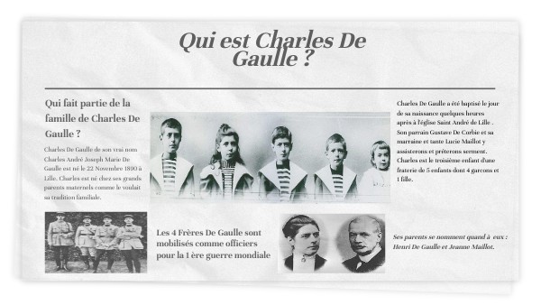 Charles De Gaulle de son vrai nom Charles André Joseph Marie De Gaulle est né le 22 Novembre 1890 à Lille. Charles est né chez ses grands parents maternels comme le voulait sa tradition familiale.