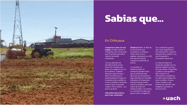dinámicos? Bien: el 90% de la información que asimilamos nos llega a través de la vista y, además, retenemos un 42% más de información cuando el contenido se mueve. Lo que lees: la interactividad y la animación pueden hacer que el contenido más aburrido se convierta en algo divertido. En Genially utilizamos AI (Awesome Interactivity) en todos nuestros diseños, para que subas de nivel con interactividad y conviertas tu contenido en algo que aporta valor y engancha.