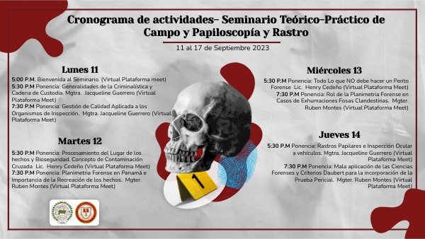 5:30 P.M Ponencia: Procesamiento del Lugar de los hechos y Bioseguridad. Concepto de Contaminación Cruzada Lic. Henry Cedeño (Virtual Plataforma Meet) 7:30 P.M Ponencia: Planimetria Forense en Panamá e Importancia de la Recreación de los hechos. Mgter. Ruben Montes (Virtual Plataforma Meet)