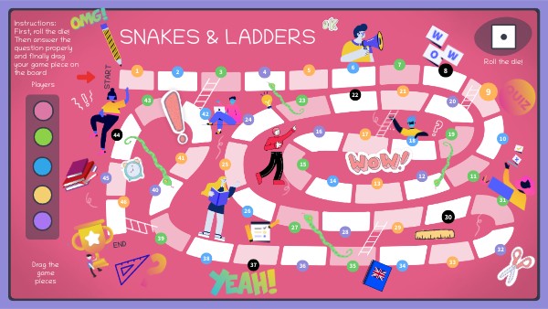 Instructions: First, roll the die! Then answer the question properly and finally drag your game piece on the board
