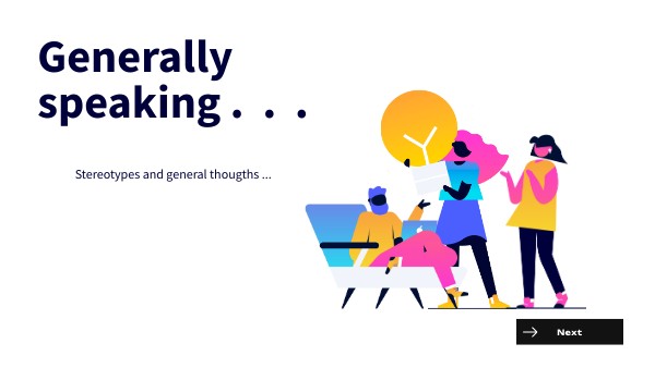 One person has to share the screen. You are going to see a number of pictures that represent a general thought or steretype. With your classmates, choose a picture, and talk about the stereotype or general thought. When you are done, choose another one to speak about. Speak about what you think about the stereotype or general thought. Is it true? Do you think is correct? Do you have any examples or experiences that proove this thought or stereotype to be right or wrong? Talk about it! REMEMBER: Remain respectful about others' points of view