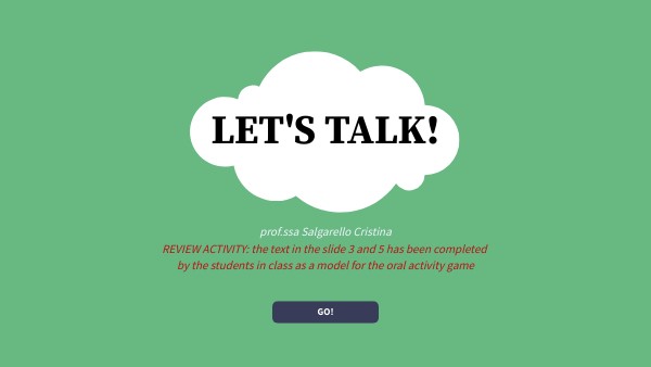 prof.ssa Salgarello Cristina REVIEW ACTIVITY: the text in the slide 3 and 5 has been completed by the students in class as a model for the oral activity game
