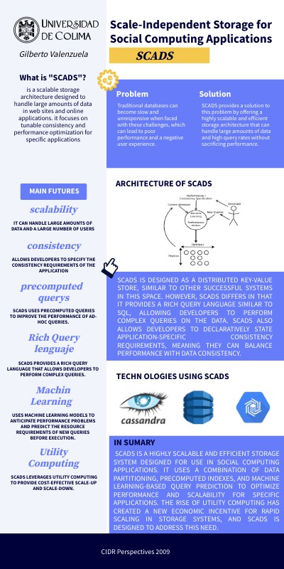 SCADS is a highly scalable and efficient storage system designed for use in social computing applications. It uses a combination of data partitioning, precomputed indexes, and machine learning-based query prediction to optimize performance and scalability for specific applications. The rise of utility computing has created a new economic incentive for rapid scaling in storage systems, and SCADS is designed to address this need.
