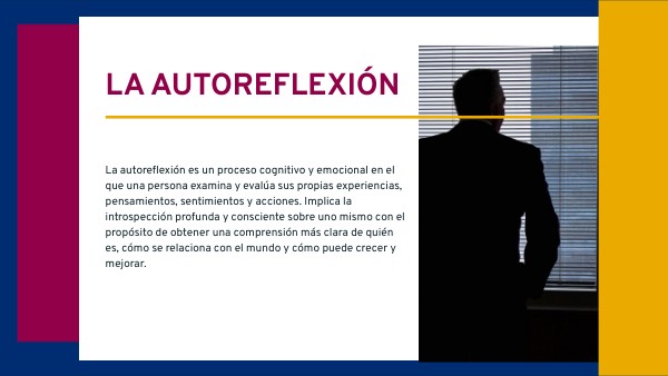 • La autoreflexión implica una conciencia profunda de los propios pensamientos, emociones, motivaciones y comportamientos. Esto incluye la capacidad de observarse objetivamente y reconocer las diferentes facetas de la propia personalidad.• La autoreflexión va más allá de simplemente observar. Implica un análisis crítico de las acciones y experiencias pasadas para comprender por qué se tomaron ciertas decisiones y cómo podrían manejarse de manera diferente. • La autoreflexión se realiza con la intención de crecimiento y mejora personal. Quienes practican la autoreflexión buscan identificar áreas en las que pueden aprender y desarrollarse, y están determinados a hacer cambios positivos en función de sus observaciones. • Aunque la autoreflexión busca la mejora, también implica aceptar y reconocer las propias imperfecciones y errores. Se trata de un equilibrio entre la autocrítica constructiva y la comprensión de que todos somos seres humanos en proceso de desarrollo. • La autoreflexión a menudo implica expresar los pensamientos y sentimientos internos, ya sea a través de la escritura, la conversación o la autoexpresión artística. Esto puede ayudar a clarificar los pensamientos y emociones, así como a procesar experiencias pasadas. • Al comprenderse a uno mismo más profundamente, es más probable que se desarrolle la empatía hacia los demás. Al reconocer los propios desafíos y luchas internas, se puede llegar a entender mejor las experiencias de los demás. La autoreflexión puede ayudar a las personas a alinear sus acciones y decisiones con sus valores y objetivos personales. Puede proporcionar claridad sobre lo que es importante y cómo se puede trabajar hacia esos objetivos.