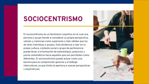 El sociocentrismo es un fenómeno cognitivo en el cual una persona o grupo tiende a considerar su propia perspectiva, valores y creencias como superiores o más válidos que los de otros individuos o grupos. Esta tendencia a caer en la propia cultura, contexto social o grupo de pertenencia puede llevar a la formación de estereotipos, prejuicios y juicios automáticos hacia aquellos que son percibidos como diferentes. El sociocentrismo puede actuar como una barrera para la comprensión genuina y el diálogo intercultural, ya que limita la apertura a nuevas perspectivas y experiencias.