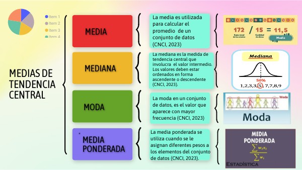 La mediana es la medida de tendencia central que involucra el valor intermedio. Los valores deben estar ordenados en forma ascendente o descendente (CNCI, 2023).