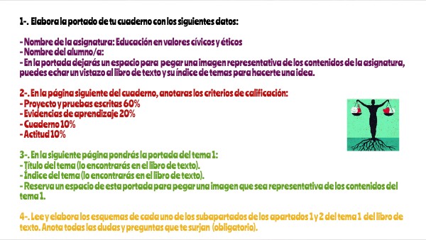 1-. Elabora la portado de tu cuaderno con los siguientes datos: - Nombre de la asignatura: Educación en valores cívicos y éticos - Nombre del alumno/a: - En la portada dejarás un espacio para pegar una imagen representativa de los contenidos de la asignatura, puedes echar un vistazo al libro de texto y su índice de temas para hacerte una idea. 2-. En la página siguiente del cuaderno, anotaras los criterios de calificación: - Proyecto y pruebas escritas 60% - Evidencias de aprendizaje 20% - Cuaderno 10% - Actitud 10% 3-. En la siguiente página pondrás la portada del tema 1: - Título del tema (lo encontrarás en el libro de texto). - Índice del tema (lo encontrarás en el libro de texto). - Reserva un espacio de esta portada para pegar una imagen que sea representativa de los contenidos del tema 1. 4-. Lee y elabora los esquemas de cada uno de los subapartados de los apartados 1 y 2 del tema 1 del libro de texto. Anota todas las dudas y preguntas que te surjan (obligatorio).