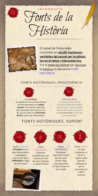 El treball de l’historiador consisteix en recollir testimonis veritables del passat per localitzar-los en el temps i interpretar-los. Tot el material utilitzat per escriure la història es denomina FONT HISTÒRICA
