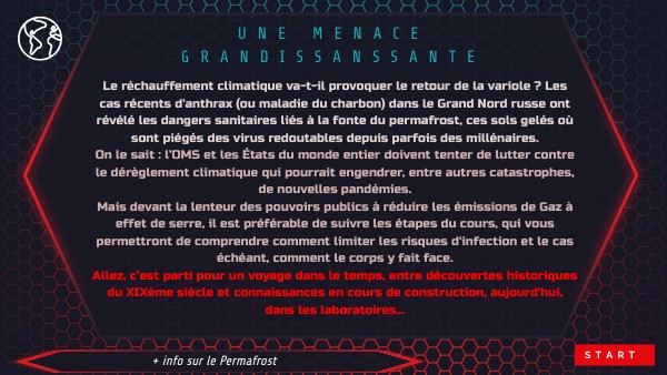 Le réchauffement climatique va-t-il provoquer le retour de la variole ? Les cas récents d'anthrax (ou maladie du charbon) dans le Grand Nord russe ont révélé les dangers sanitaires liés à la fonte du permafrost, ces sols gelés où sont piégés des virus redoutables depuis parfois des millénaires.On le sait : l’OMS et les États du monde entier doivent tenter de lutter contre le dérèglement climatique qui pourrait engendrer, entre autres catastrophes, de nouvelles pandémies. Mais devant la lenteur des pouvoirs publics à réduire les émissions de Gaz à effet de serre, il est préférable de suivre les étapes du cours, qui vous permettront de comprendre comment limiter les risques d'infection et le cas échéant, comment le corps y fait face. Allez, c’est parti pour un voyage dans le temps, entre découvertes historiques du XIXème siècle et connaissances en cours de construction, aujourd'hui, dans les laboratoires...