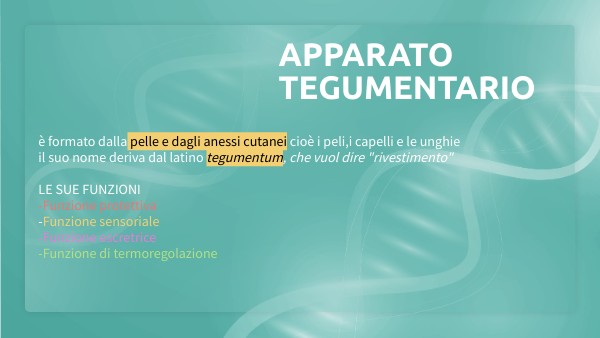 è formato dalla pelle e dagli anessi cutanei cioè i peli,i capelli e le unghie il suo nome deriva dal latino tegumentum, che vuol dire "rivestimento" LE SUE FUNZIONI -Funzione protettiva -Funzione sensoriale -Funzione escretrice -Funzione di termoregolazione