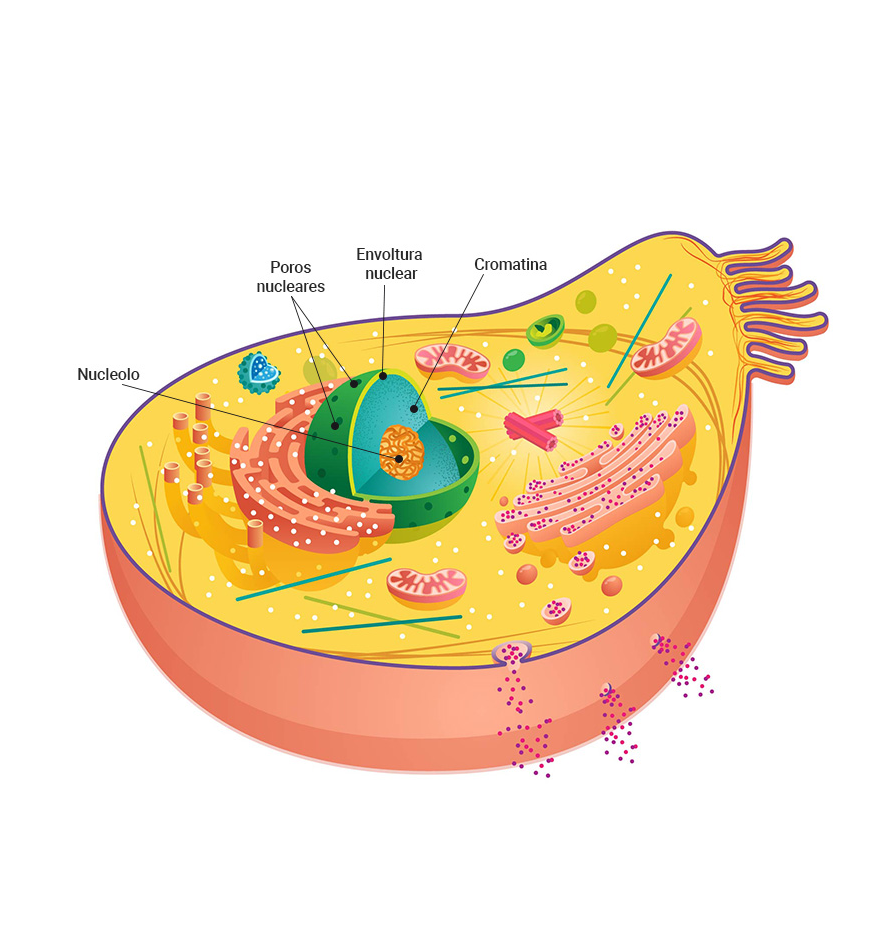 El nucli és un orgànul força gran on a dins porta el material genètic de la cèl·lula L'embolcall nuclear són dues membranes amb centenars de porus on formen una paret que separa el citoplasma del nucli A l'interior del nucli podem trobar el nuclèol que és la part més densa del nucli.